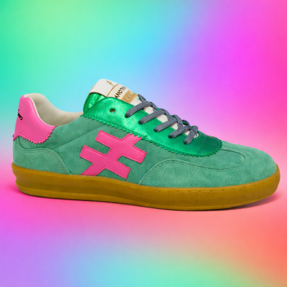 Vento green suede and metallic leather combo on a durable gum rubber outsole.