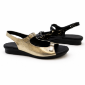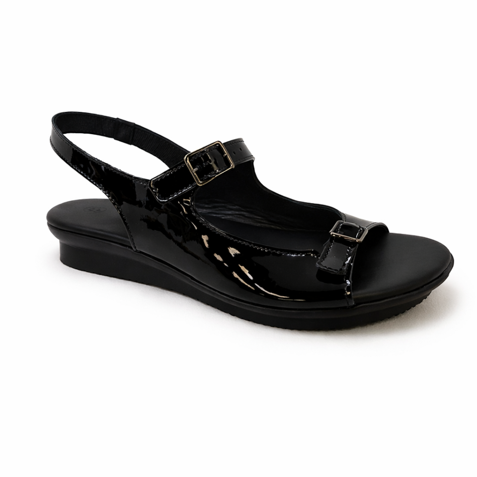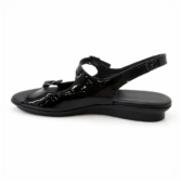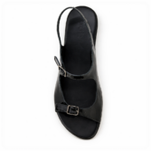 Slingback flat sandal with full grain soft leather uppers. This dressy flat sandal features functional buckles and a 2.5 cm flat heel on a black formula rubber outsole.