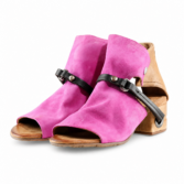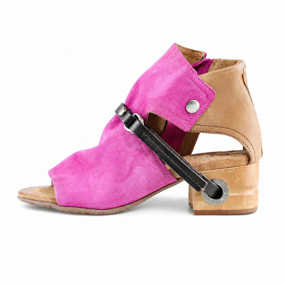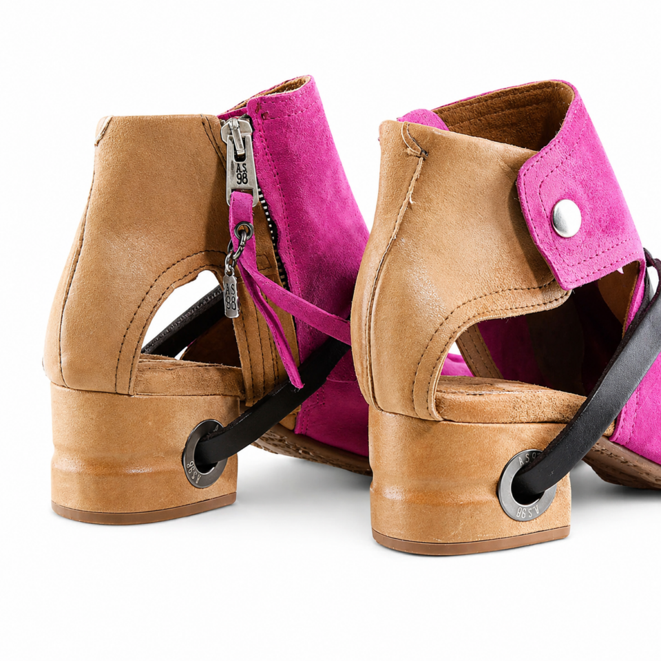 The FANTASIA by A.S.98 is a bold Italian-crafted sandal bootie designed for statement styling. Made from premium hand-finished suede and leather, this open-toe silhouette features architectural cutouts, a sculpted stacked heel, and signature A.S.98 hardware detailing.