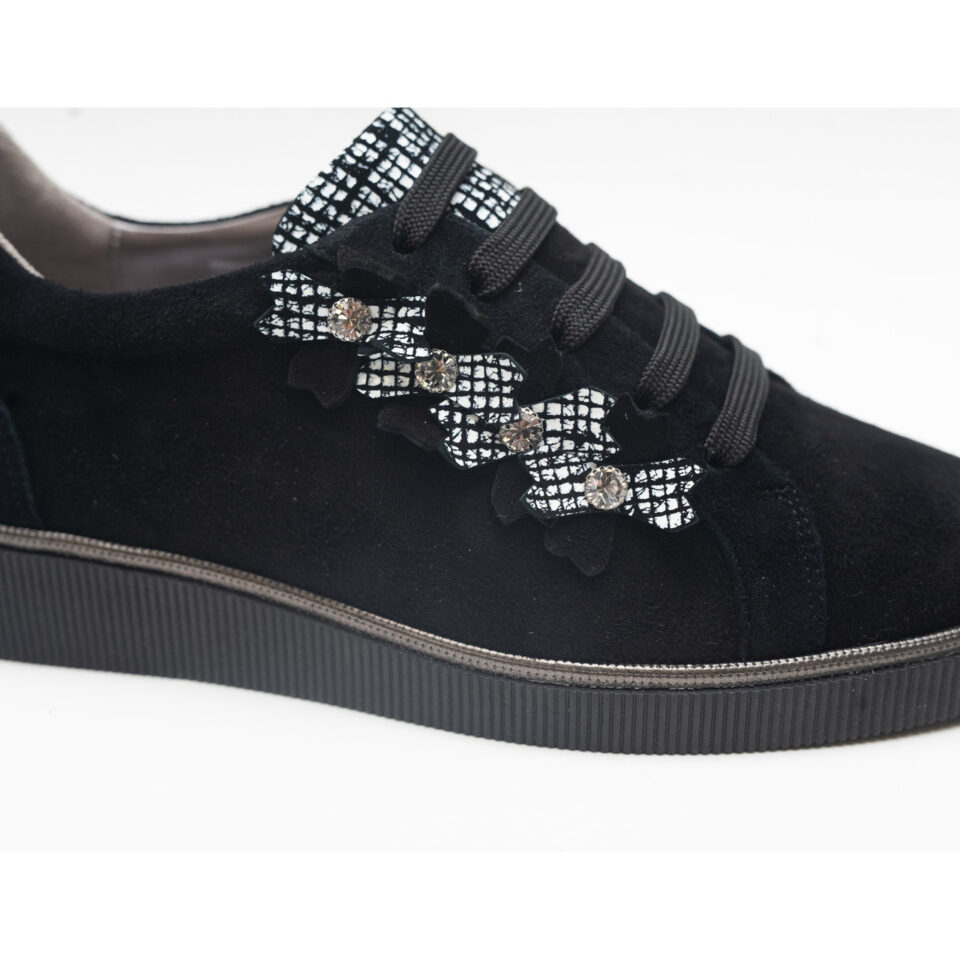 Fashionable dress walking shoe, ideal for business or travelling. Soft suede leather upper with leather linings and a padded insole with a durable rubber outsole. Details include rhinestones and welting.
