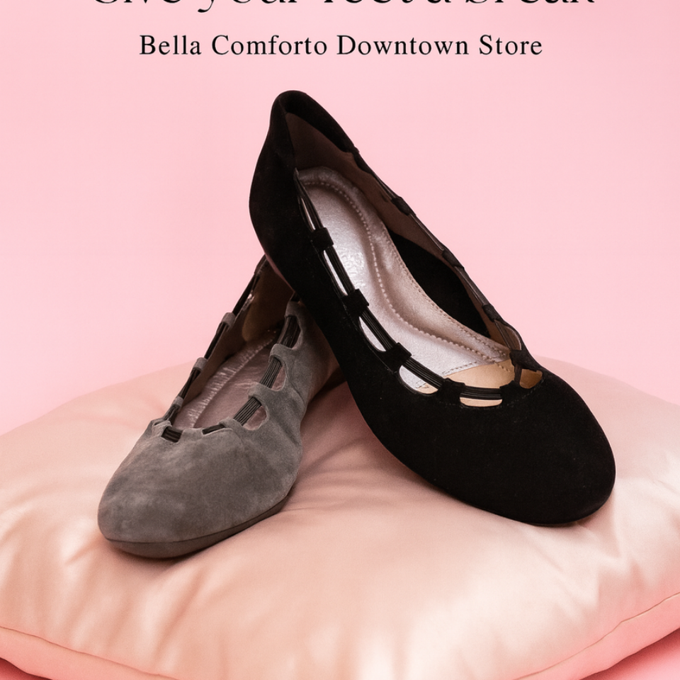 Ballet in soft suede with leather linings. Made in Portugal style Bena from Bella Comforto features elastic top line , padded insoles with a soft arch as well as a rubber outsole,.