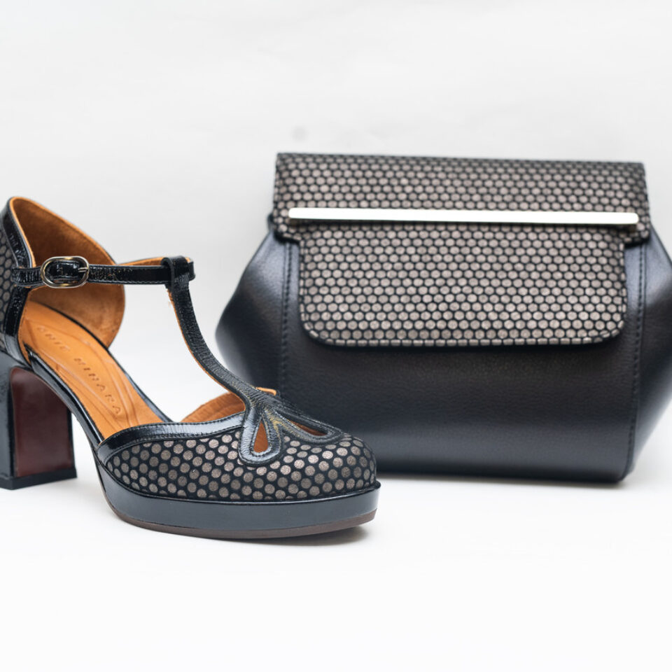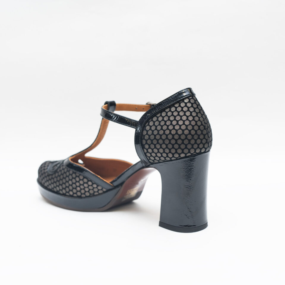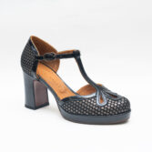 Hand made in Spain. Chie Mihara Demelia features a T-bar strap , functional buckle with a graphic-printed upper. The stacked heel is 2 3/4 inches with a 1 inch platform. All leather with soft leather linings , comfort round toe and a leather outsole with a non-slip rubber tap.