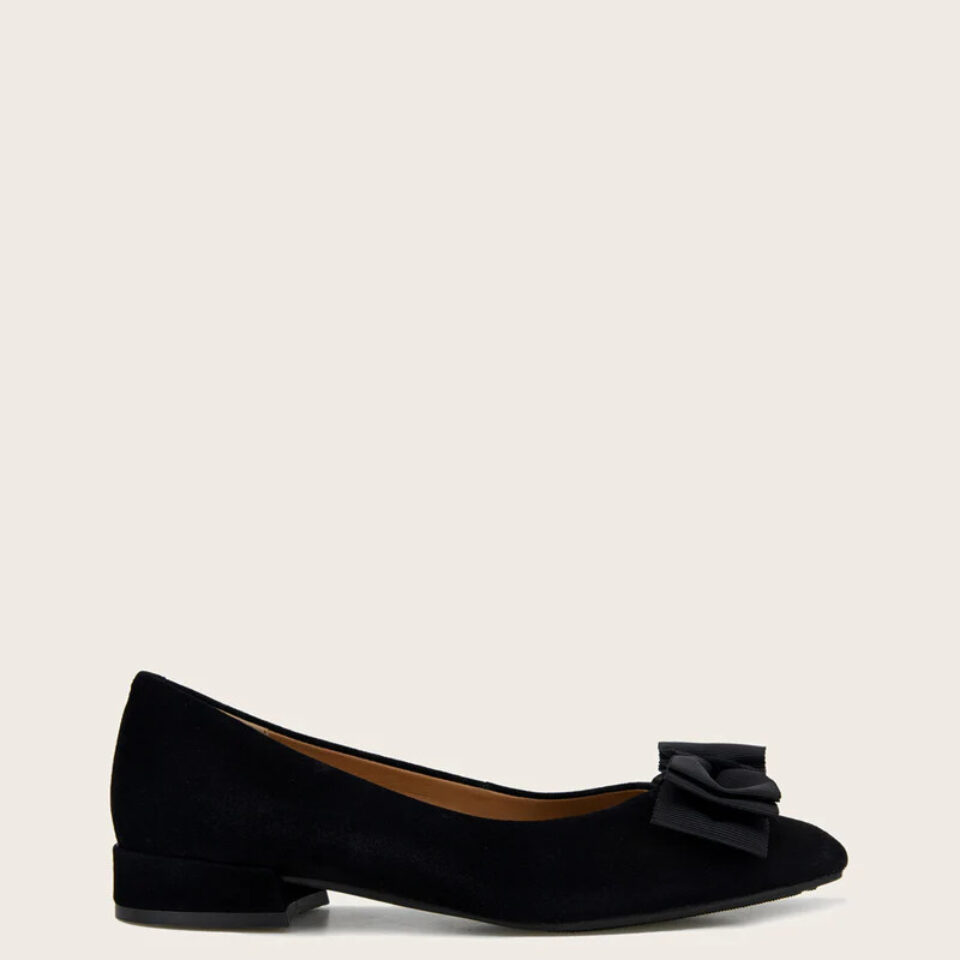 Flats are fab and Atlas from gentle Souls strikes the perfect balance between fashion and comfort. Features include a panted cushion footbed featuring flax seeds in elastic pouches mirroring the sensation of walking on sand. A defined soft arch support and a soft suede upper with leather linings with a detailed bow on the vamp. Outsole is durable TPR rubber providing some traction and adding to the comfort.