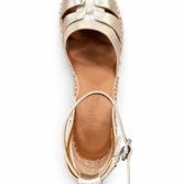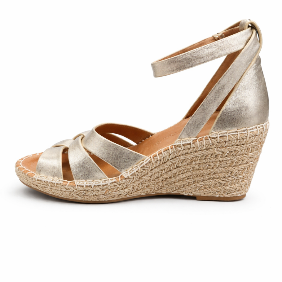 This espadrille wedge sandal features a suede leather upper, padded insoles and a rubber outsole. The back strap includes a functional buckle