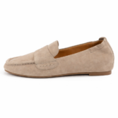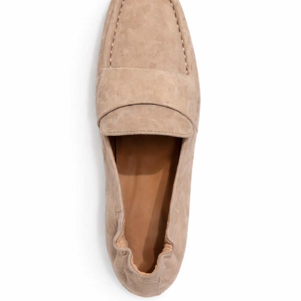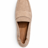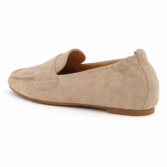 Very soft loafer in suede leather with square toe. Features include padded insoles and soft leather linings and a flex rubber outsole.