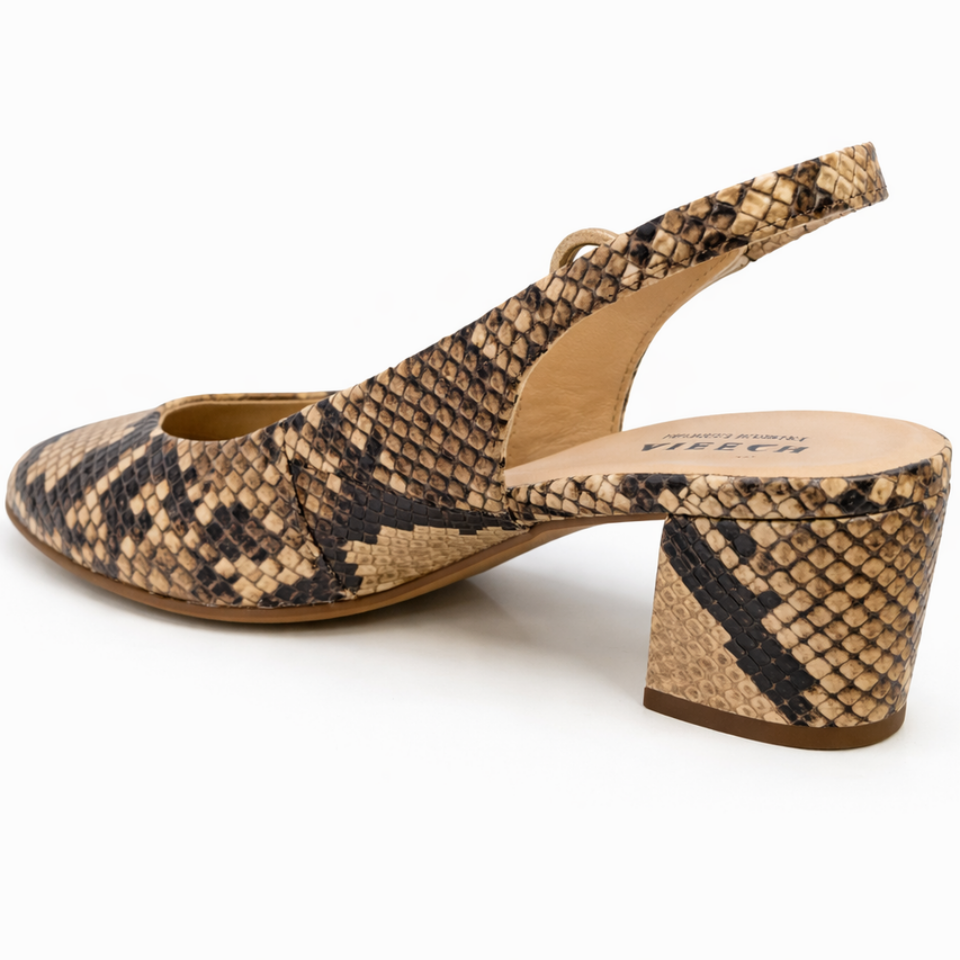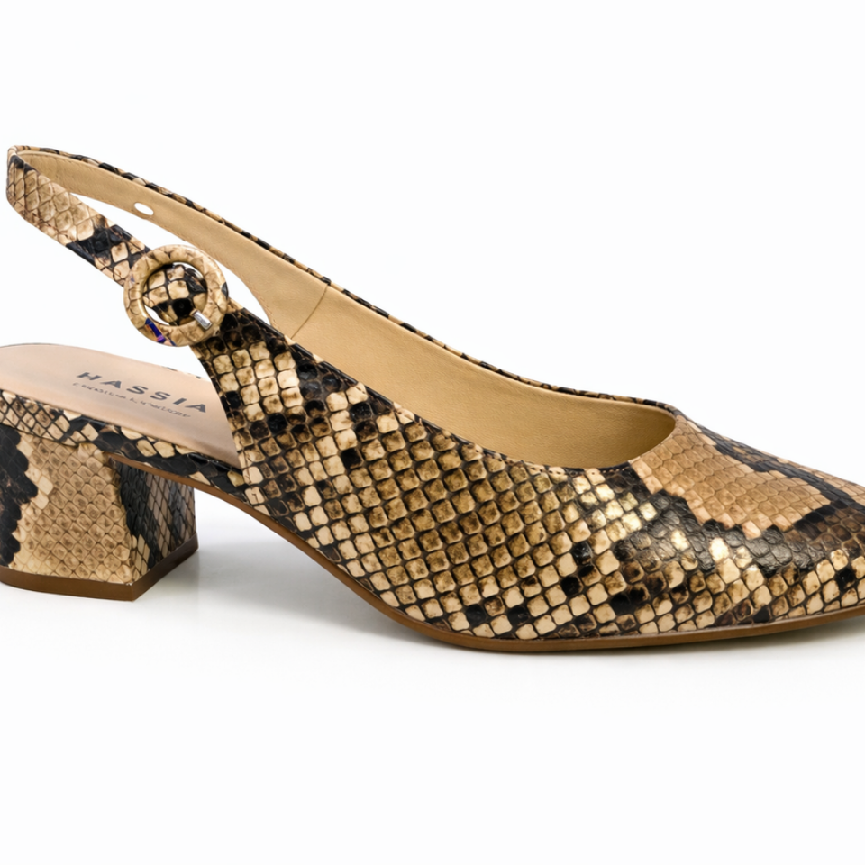 The Hassia 45mm closed toe open back sling is a classic. The animal print is nice and neutral all leather lined with a padded leather insole. The heel is covered leather with a stable base. Other features include a functional buckle and a non-slip bottom.