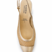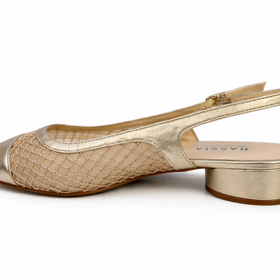 Elegance without the height. This 25mm sling back features a leather and mesh upper as well as a non slip outsole. Ideal for both indoor and outdoor. Strap includes a functional buckle and heel is a modern round broad base.