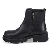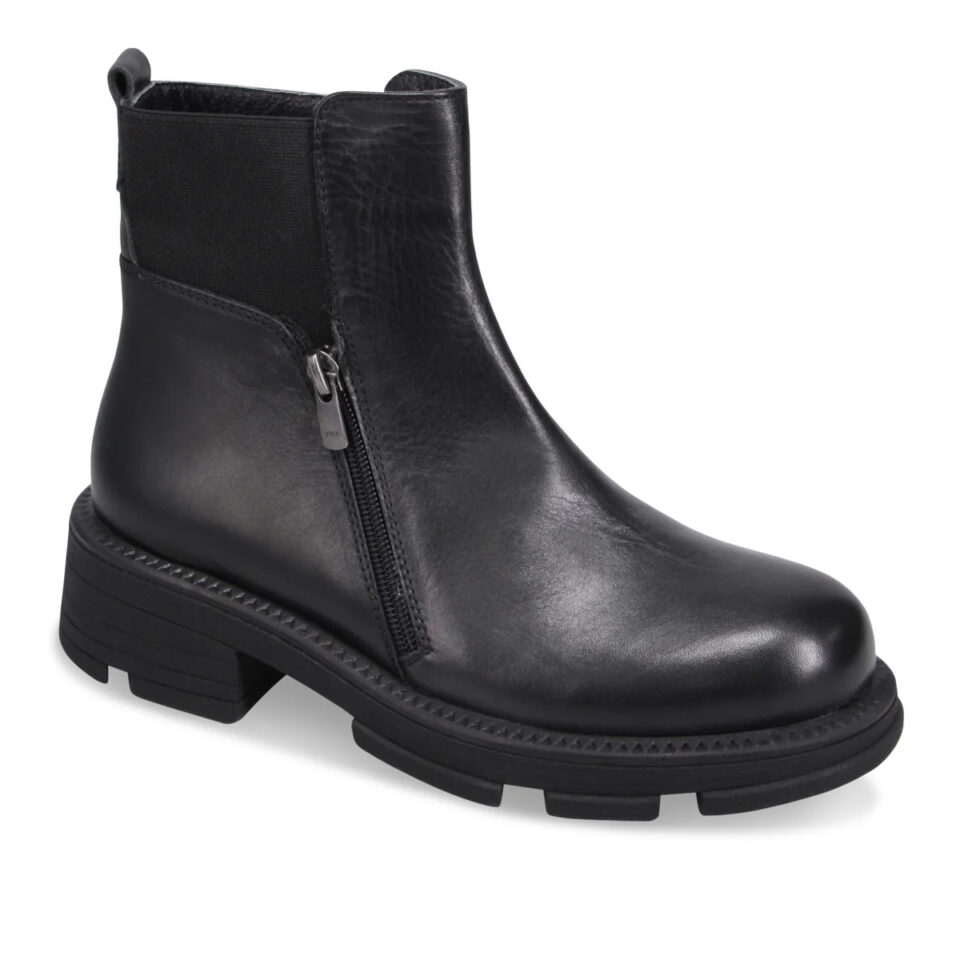 Make a bold move in this black leather ankle boot with a modern, utilitarian edge. Designed with a rugged black lug sole and dual detailing—zip closure and side stretch panel—it’s equal parts functional and fashion-forward. That’s Amore!