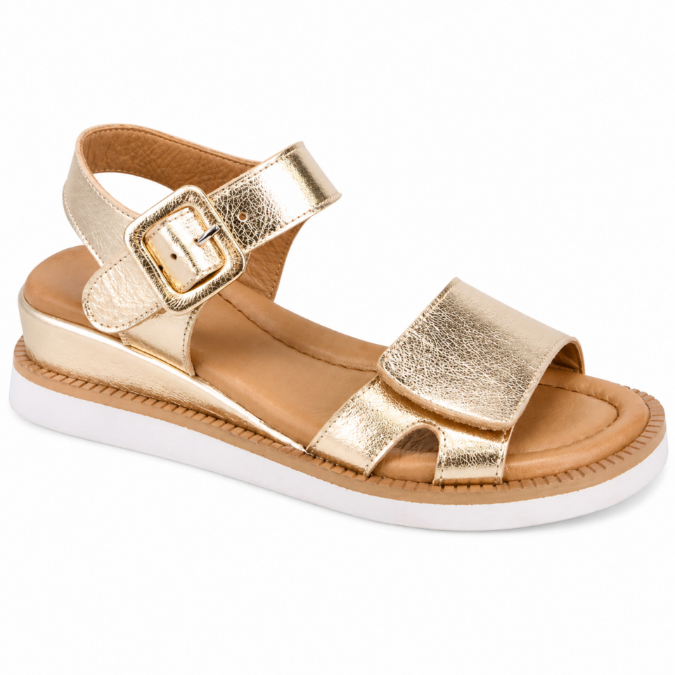 Soft leather sandal with cushion rubber outsoles and a leather padded insole. Large velcro forefoot strap makes for a perfect fit.