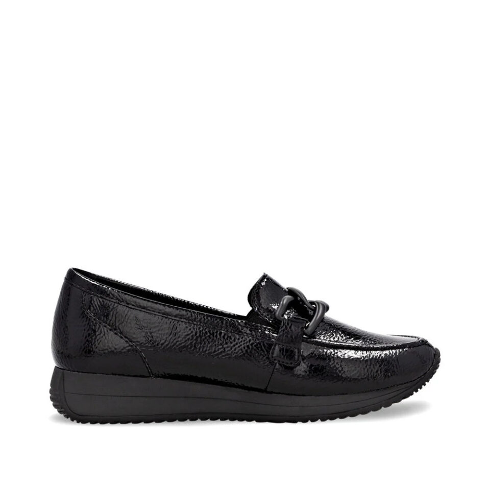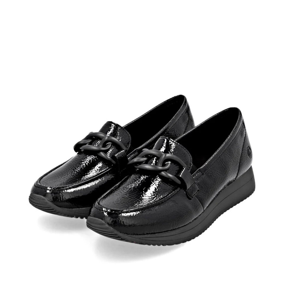 Comfort brought to perfection: these black remonte loafers are not only ultra stylish, they also score with their comfort features. The elastic bands allow for easy donning. The decorative chain gives the shoe that certain something. The Lite ‘n Soft technology with its ultra-light sole and padded and removable insole ensures a comfortable feeling. The loafers are equipped with a light microvelour lining.