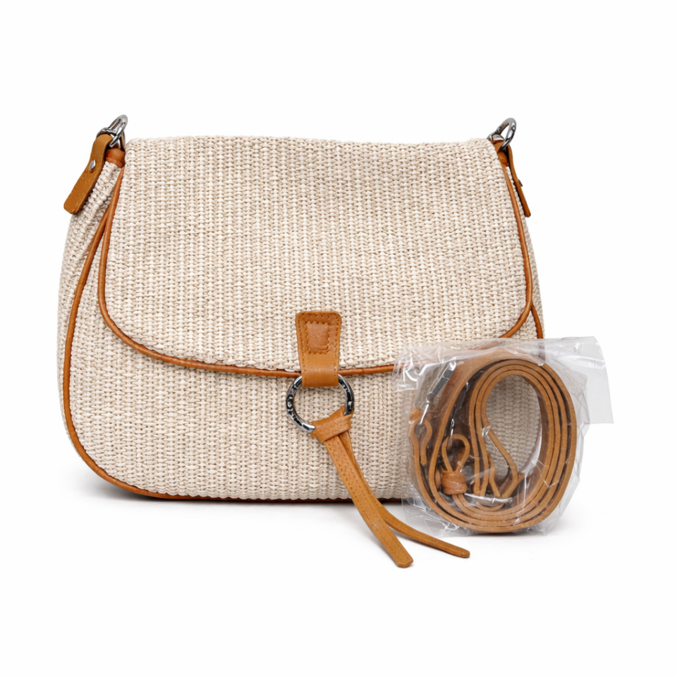 Raffia with genuine deer effect leather trim, nickel accessories
