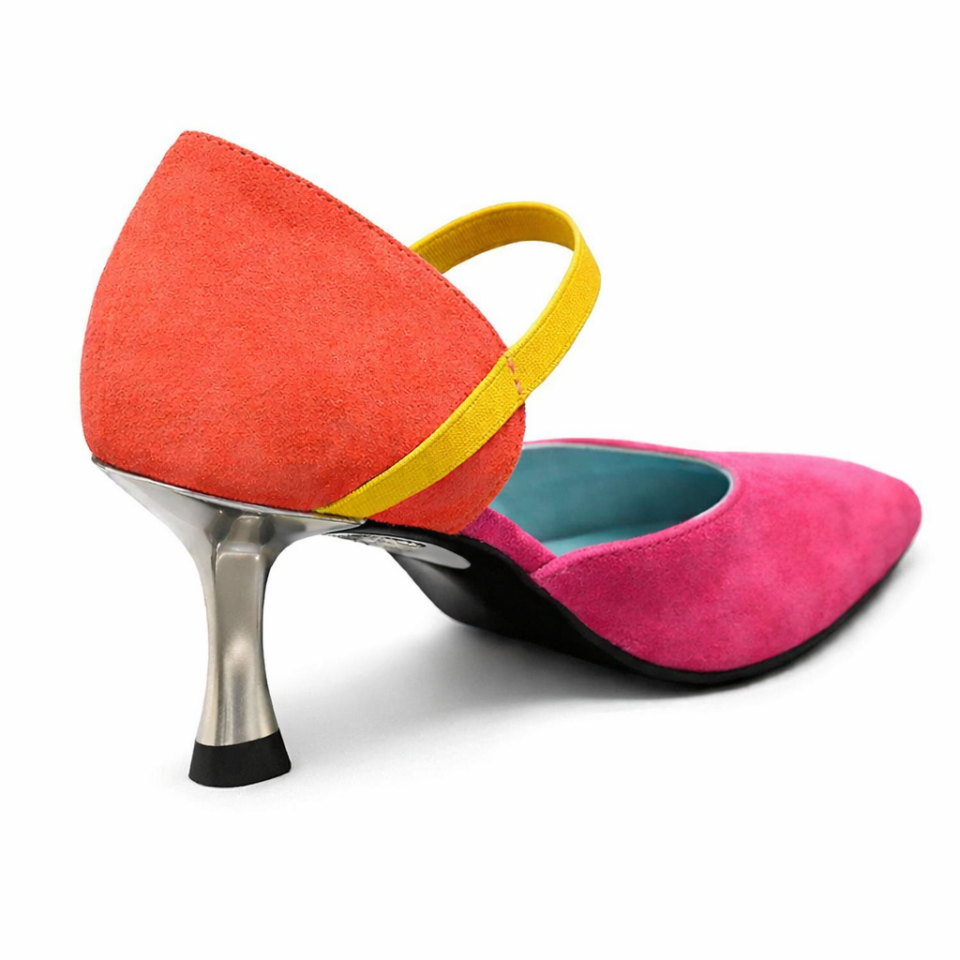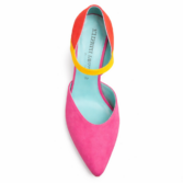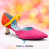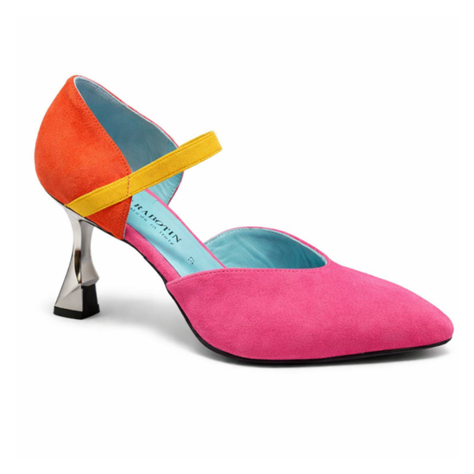 Enjoy the compliments. This Thierry Rabotin vision of a D’Orsay with a Maryjane elastic strap is built for comfort as much as it is for fashion. Soft suede multi colour upper with equally soft leather linings and insole. The 2 inch metal heel looks striking. All done on a comfort flex outsole.