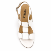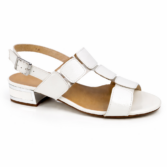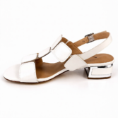 T-strap sandal with illusion vinyl. Buckle with hidden elastic insert. Padded insole. 1.5 inch covered block heel with metallic trim.
