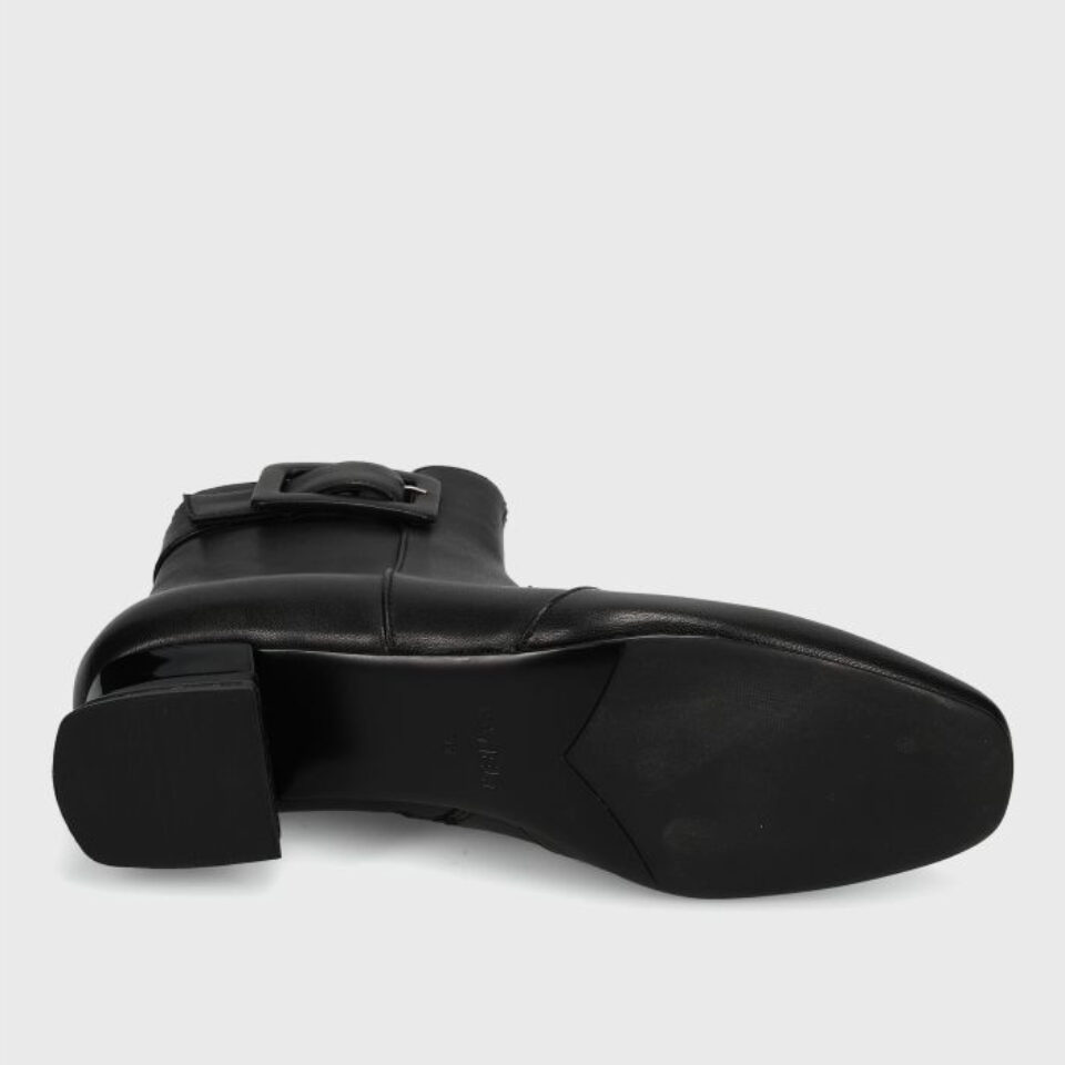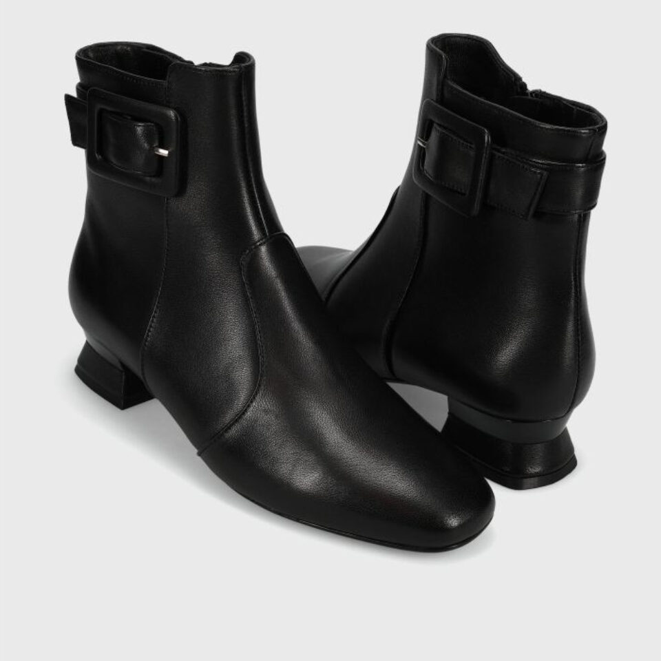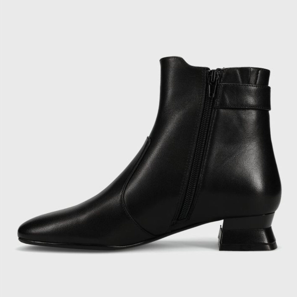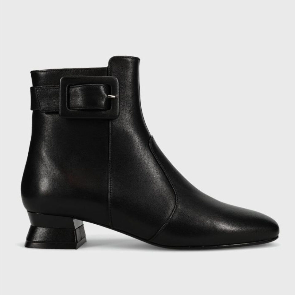 Rounded square-toe ankle boot. Inside zipper for easy off and on. Attached tab with matching buckle. 1.25 inch covered mixed material heel and a non-slip outsole.