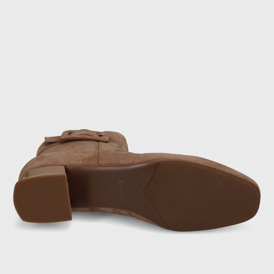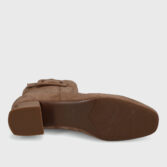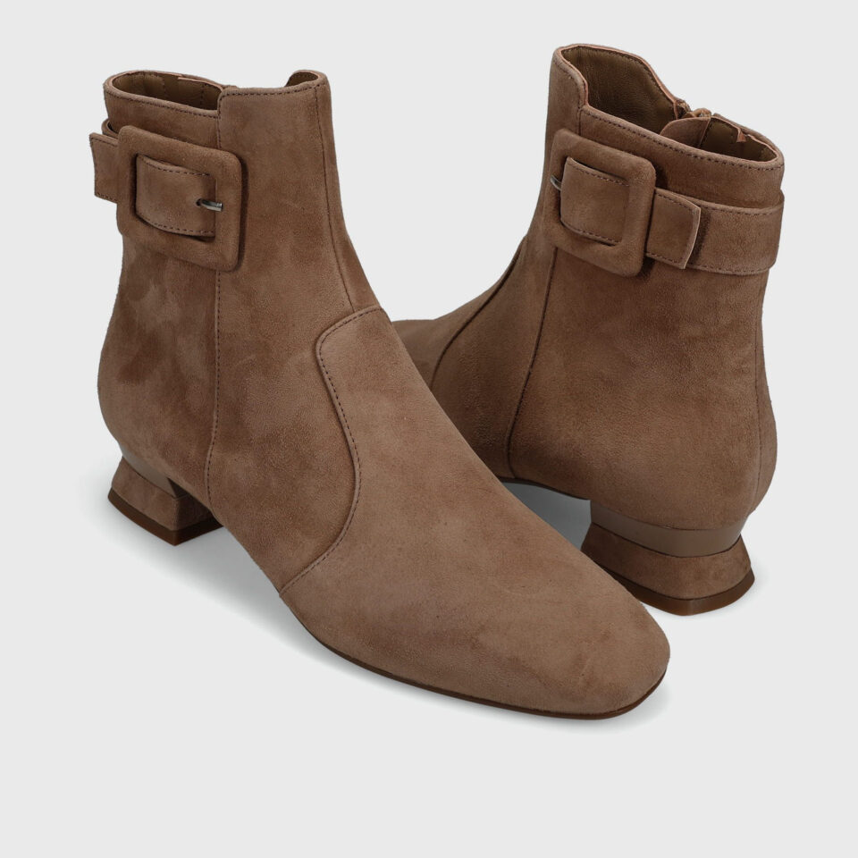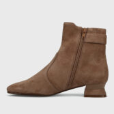Rounded square-toe ankle boot. Side zip. Attached tab with matching buckle. 1.25 inch covered mixed material heel..